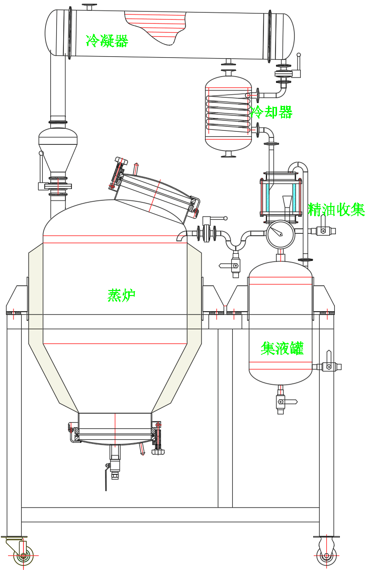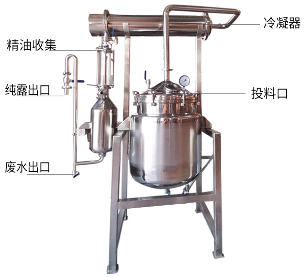 個大的不銹鋼蒸餾容器 ( 蒸餾器 ), 在容器 底部加熱 或 通入蒸汽。當炙熱的蒸氣充滿在容器里,會將植物內(nèi)存的芳香精油成分隨著水蒸氣蒸發(fā),并且隨著水