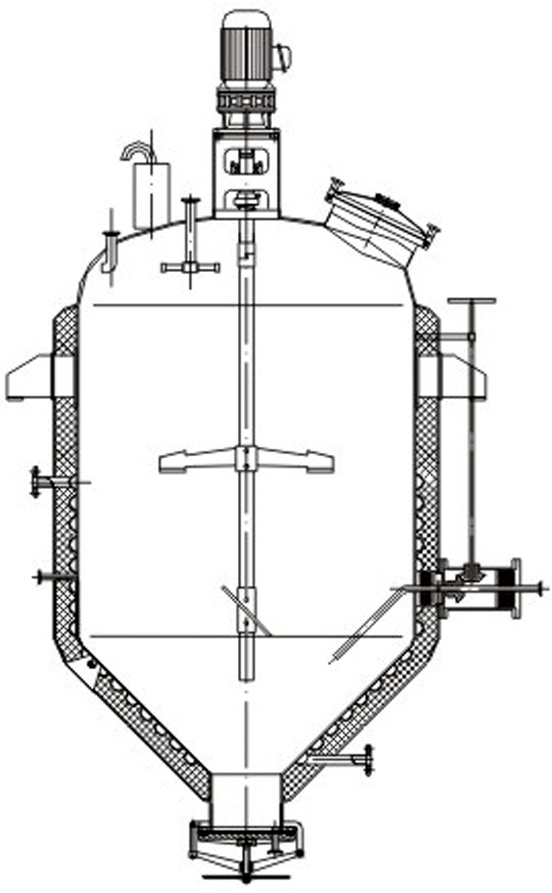 主要由附夾套的橢圓封頭、錐底形的筒體、內(nèi)裝三葉式攪拌以及特殊的微調(diào)旋出液管等組裝而成。